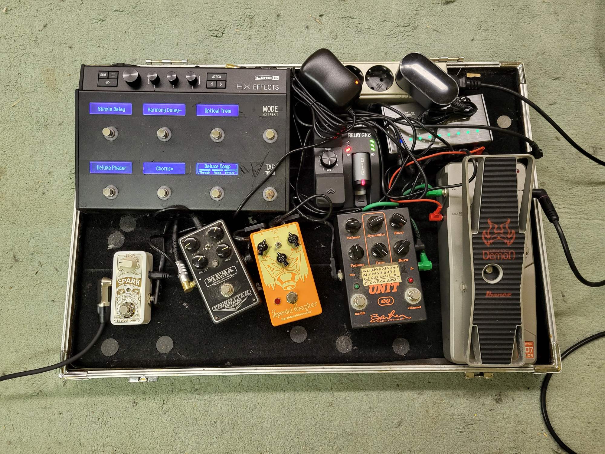 Hier eines meiner Effektboards. Und eine Gitarre. Später mehr.